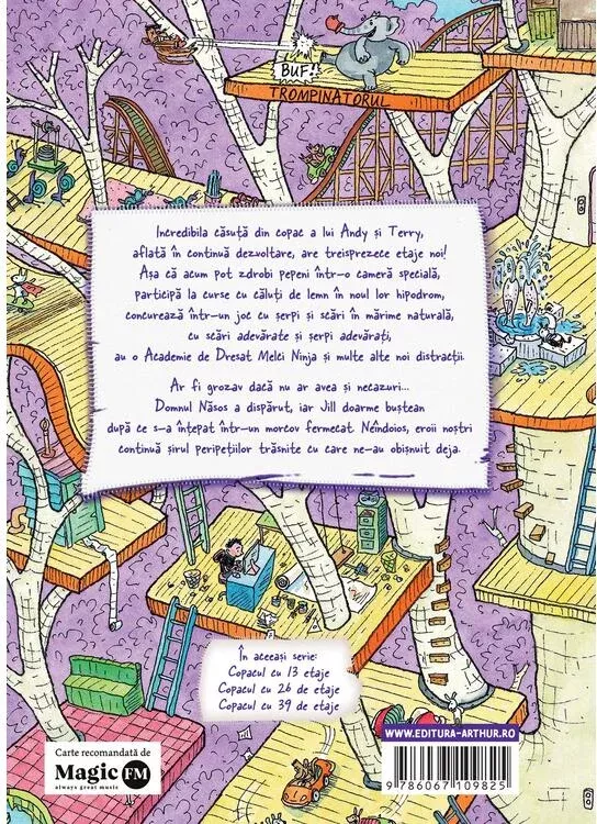 Casuta din copac a lui Andy si Terry are treisprezece etaje noi! Incredibila casuta din copac a lui Andy si Terry, aflata in continua dezvoltare, are treisprezece etaje noi! Asa ca acum pot zdrobi pepeni intr-o camera speciala, participa la curse cu caluti de lemn in noul lor hipodrom, concureaza intr-un joc cu serpi si scari in marime naturala, cu scari adevarate si serpi adevarati, au o Academie de Dresat Melci Ninja si multe alte noi distractii. Ar fi grozav daca nu ar avea si necazuri... Domnul Nasos a disparut, iar Jill doarme bustean dupa ce s-a intepat intr-un morcov fermecat Neindoios, eroii nostri continua sirul peripetiilor trasnite cu care ne-au obisnuit deja.