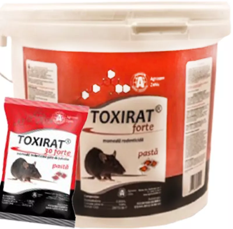 Momeala TOXIRAT FORTE este pe suport de cereale impregnate cu BROMADIOLONE care datorita structurii sale atrage soarecii si sobolanii. Este eficient si usor de utilizat, lucrul incepe imediat ce momeala a fost ingerata dar moartea survine dupa doar cateva zile, fara suferinta, inlaturand suspiciunea pe care alte rozatoare o pot avea fata de momeli.